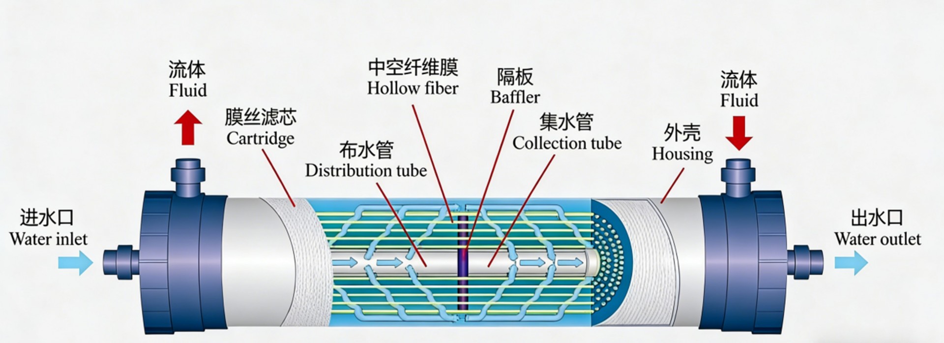 ③分离效率更高:海纳环保在膜接触器组件中央设置了导流挡板,配合中心管布水模式,使液体在膜丝的表面成射流状态,让膜丝外液体流动方向与膜丝内气体流动方向成一定的角度,有效地改善了流道,大大提高了壳程和管程的传质效率。